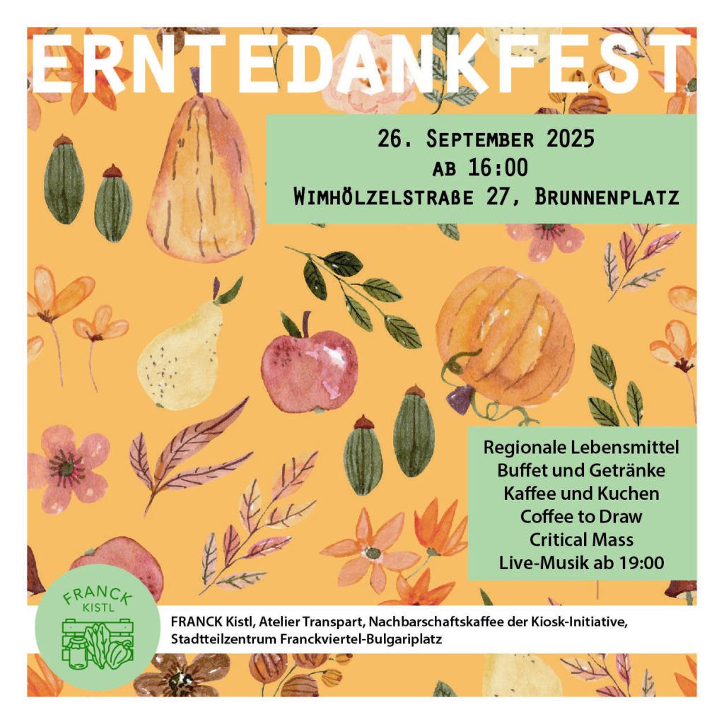 Wir laden dich herzlich ein, mit uns ein Erntedankfest zu feiern! Am Freitag 26. September 2025 ab 16 Uhr gibt es beim Franckkistl Essen, Trinken und gute Unterhaltung!